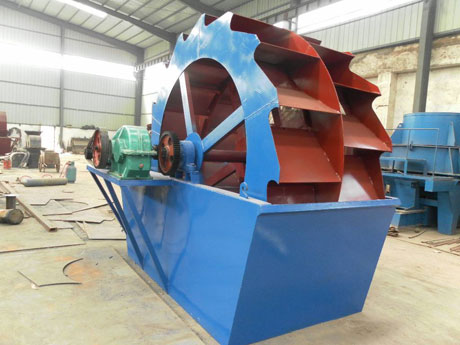輪斗式洗砂機工作時,電極通過三角帶、減速機、齒輪減速后帶動葉輪緩慢轉動,砂石有給料槽進入洗槽中,在葉輪的帶動下翻滾,并互相研磨,出去覆蓋在砂石表面的雜質,同時破壞包覆在砂粒的水汽層,以利于脫水;同時加水,形成強大水流,及時將雜質及比重小的義務帶走,并從溢出口洗槽排出,完成清洗作用。干凈的砂石由葉片帶走,砂石從旋轉的葉輪倒入出料槽,完成砂石的清洗作用。