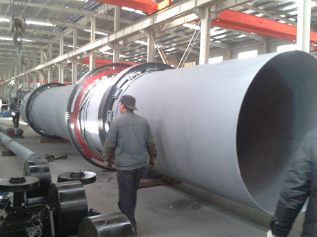 礦渣由傳送帶送到料斗,然后通過加料管道送到加料端。 烘干機(jī)圓筒是一個與水平線略成傾斜的旋轉(zhuǎn)圓筒 ,物料在筒體轉(zhuǎn)動受重力作用運行到較底的一端。 濕物料在筒體內(nèi)向前移動過程中,直接或間接得到了載熱體的給,使?jié)裎锪系靡愿稍铮缓笤诔隽隙私?jīng)皮帶機(jī)或螺旋輸送機(jī)送出。